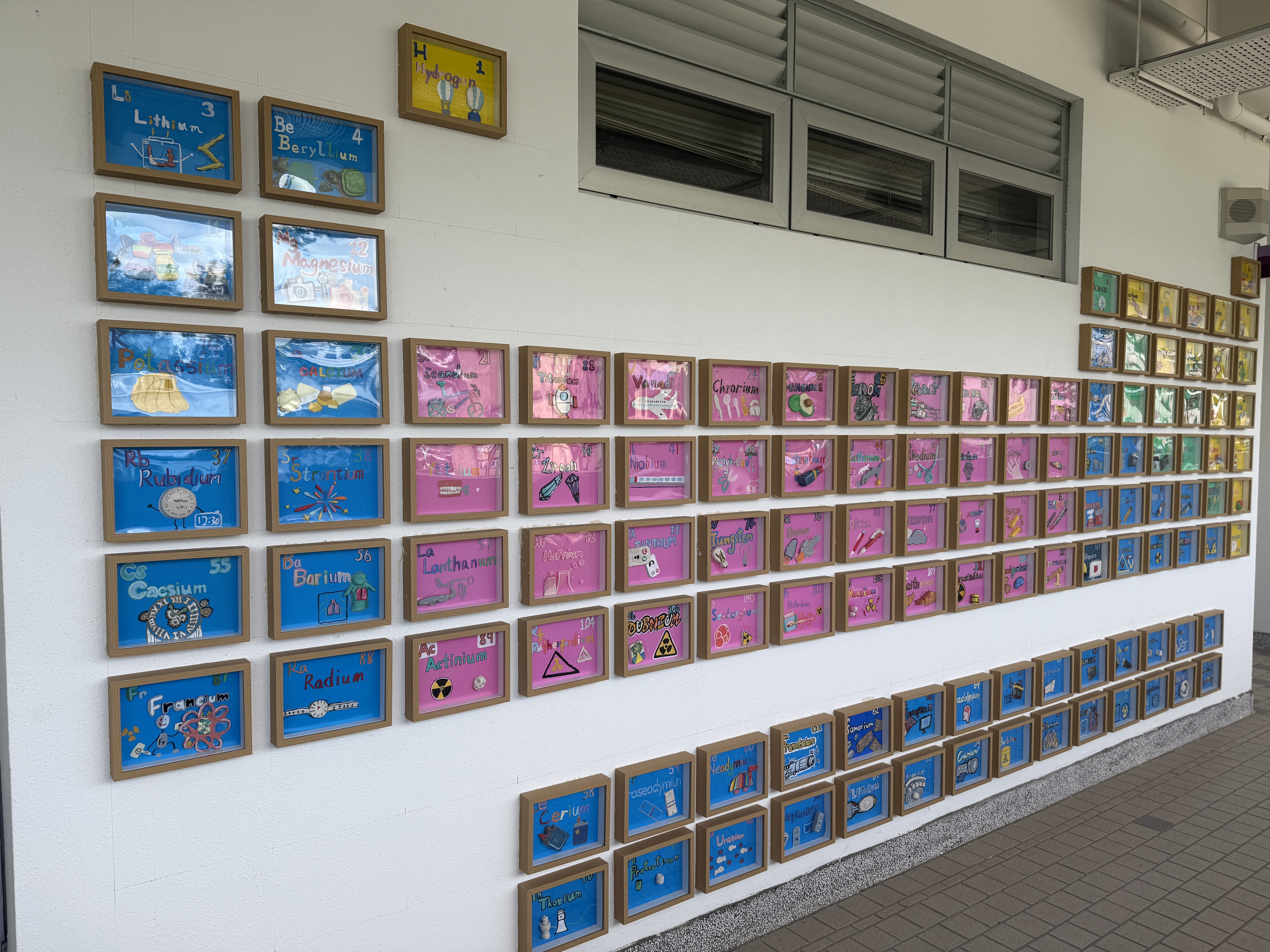Once all artworks were completed, mounting all 118 pieces neatly on the wall became another challenge. Teachers and students carefully measured and marked the wall before installing the artworks with suitable adhesives. The spectacular periodic table wall was finally completed, bringing a vibrant fusion of science and art to our campus.